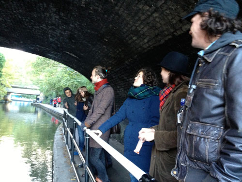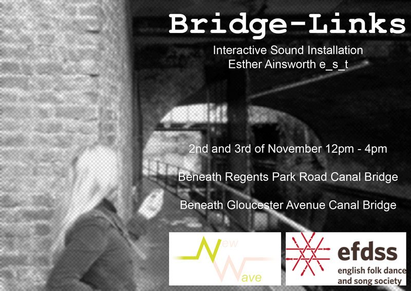 over a period of 50 days, field recordings were collected at locations along locations of the regents canal from primrose hill to kings cross. towpath users were invited to help in the creation of the work by contributing their own sound recordings via mobile phone or online. the recordings were used to create a sound composition which was installed beneath the canal bridges of the regents park canal, using the bridges and water to reflect the sound and create an acoustic chamber for those who stopped to listen. the sound clips were then reworked using a series of perameters and loops set in generative software to create gestures, patterns and rhythms, inspired by elements of traditional canal song. prior to begining this project, esther studied the history of canal song at the vaughan williams memorial library at cecil sharp house. the project considered the canal and the bridges along it as both a physical and virtual network between the people and places of the borough of camden. following the festival, the culmination of work was exhibited twice in cecil sharp house as part of the launch of the new foyer and lift utilitiy for people to experience as they moved around the building. more information about this project is available on request via the artist. |